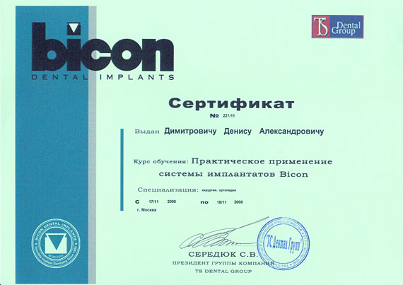Зубные импланта Bicon стабильны и прекрасно приживаются. Их можно устанавливать одномоментно с удалением зуба, на них можно сразу же устанавливать временные коронки! Ещё одним бесспорным преимуществом имплантации зубов Bicon является то, что в определенных клинических ситуациях (например, при дефиците места для коронки и нежелании пациента проходить ортодонтическое лечение) можно отказаться от изготовления коронки вообще! В этом случае можно просто сделать облицовку наддесневой части импланта специальным материалом, цвет которого будет максимально соответствовать цвету своих собственных зубов. Соединение над- и внутрикостной части максимально защищает область импланта от микробного обсеменения и удобно для гигиенического ухода. Система имплантации Байкон является не только надежной и универсальной, но и эстетичной. 20-летний опыт работы показывает, что эти импланты не дают потемнения десны даже через много лет эксплуатации.
