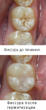 Процедура герметизации фиссур представляет собой их заполнение герметиком, который запечатывает эти канавки и сглаживает жевательную поверхность зуба. Конечно же, перед этим зубы очищаются от зубного налета, их поверхность обрабатывается антисептиком, затем кислотой, а после этого высушивается и фиссуры заполняются герметиком. Требуется герметизация фиссур достаточно выраженных, неглубокие и открытые фиссуры запечатывать нет необходимости. А если зуб уже поражен кариозным процессом, возможно ли проведение герметизации фиссур? Если патологический процесс находится на начальных стадиях и поражение тканей зуба незначительное, то можно. Сначала удаляются пораженные ткани зуба, после этого дефект заполняется специальным стеклоиономером, а уже после этого герметизируются фиссуры.