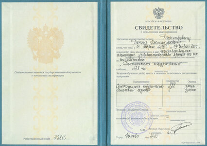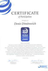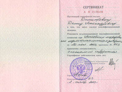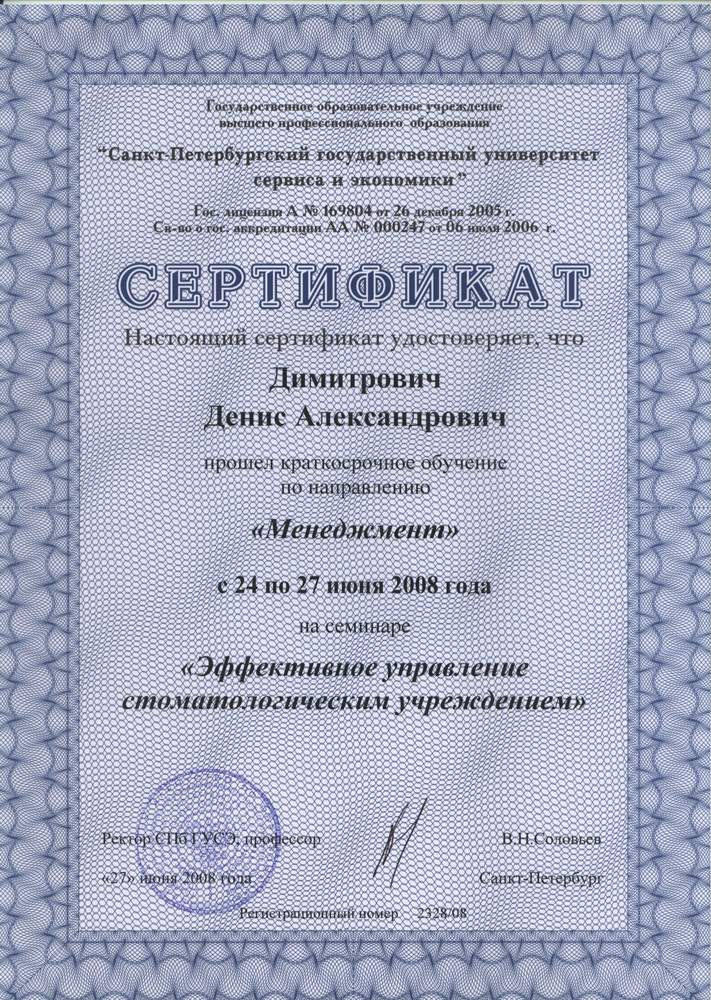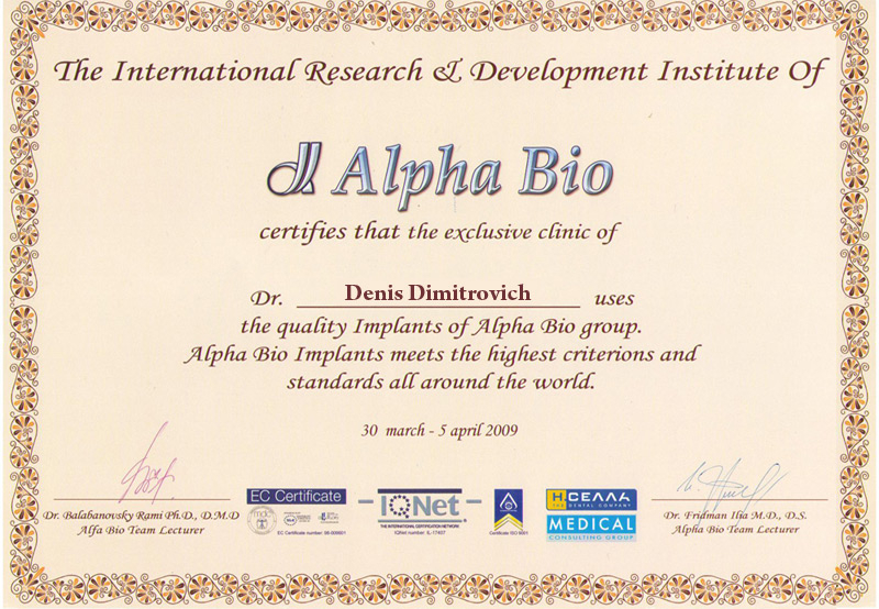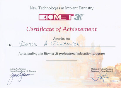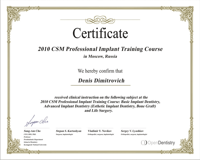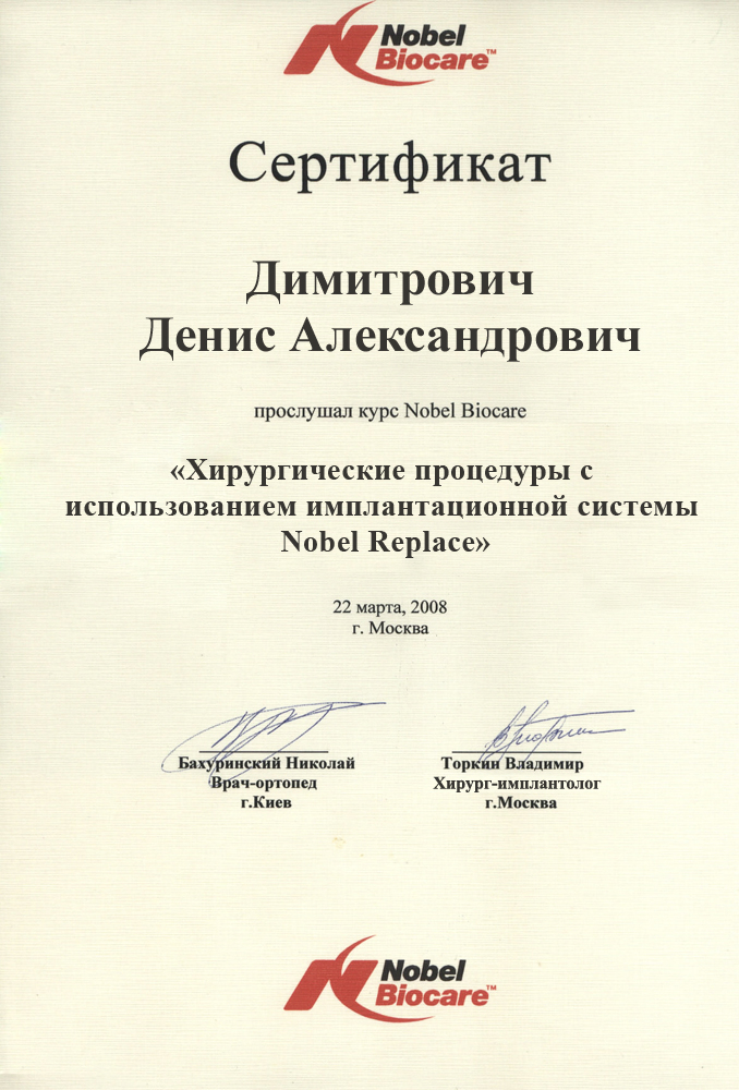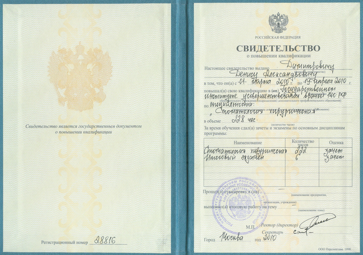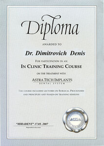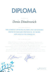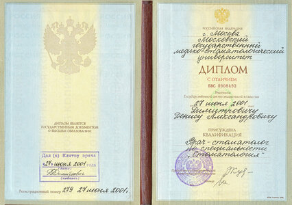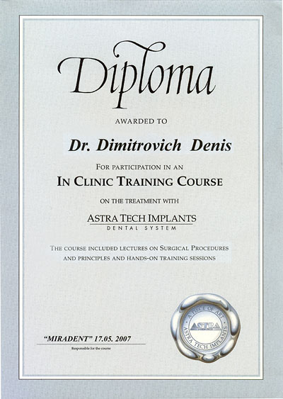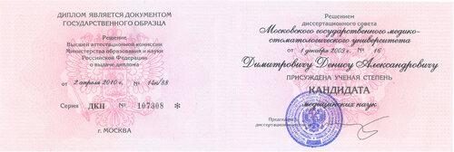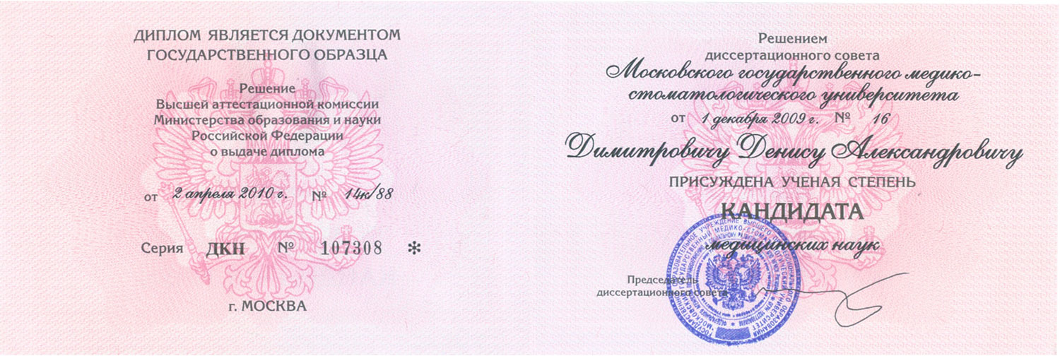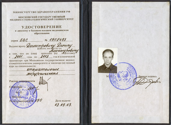 Димитрович Денис Александрович 1979 года рождения, в 2001 году получил диплом МГМСУ с отличием и поступил в клиническую ординатуру на кафедру госпитальной хирургической стоматологии и челюстно-лицевой хирургии МГМСУ.