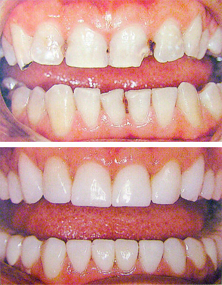 Если разрушения очень серьезные, то реставрация фронтальных зубов проводится при помощи металлокерамических коронок.