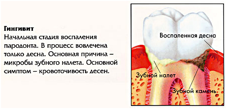Главная причина воспаления десен - бактерии, скапливающиеся в виде бесцветной пленки. Если игнорировать подобный налет, он по прошествии некоторого времени отвердеет и образует грубый пористый нарост, хорошо известный всем как зубной камень.