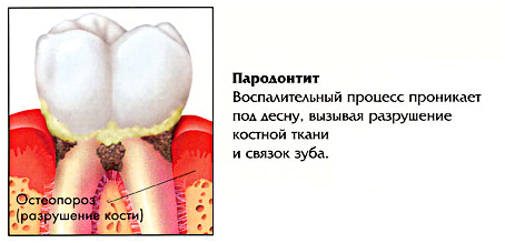 При прогрессировании зубного камня происходит разрушение тканей, которые поддерживают зубы. Между зубом и десной образуется пространство - зубодесневой карман, который заполняется налетом. Кость, поддерживающая зубы, подвергается постоянному разрушению. В результате, если не лечить десны, зубы постепенно расшатываются и выпадают.